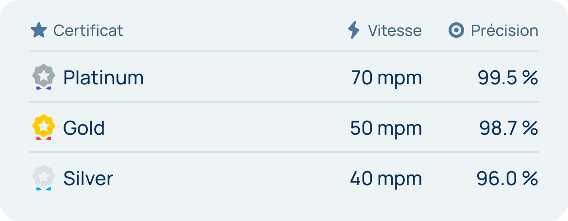 En outre, le niveau du certificat que vous recevez est également basé sur votre précision, ainsi que sur votre vitesse. Il est donc important de viser à la fois la vitesse et la précision pour obtenir un certificat de niveau supérieur.