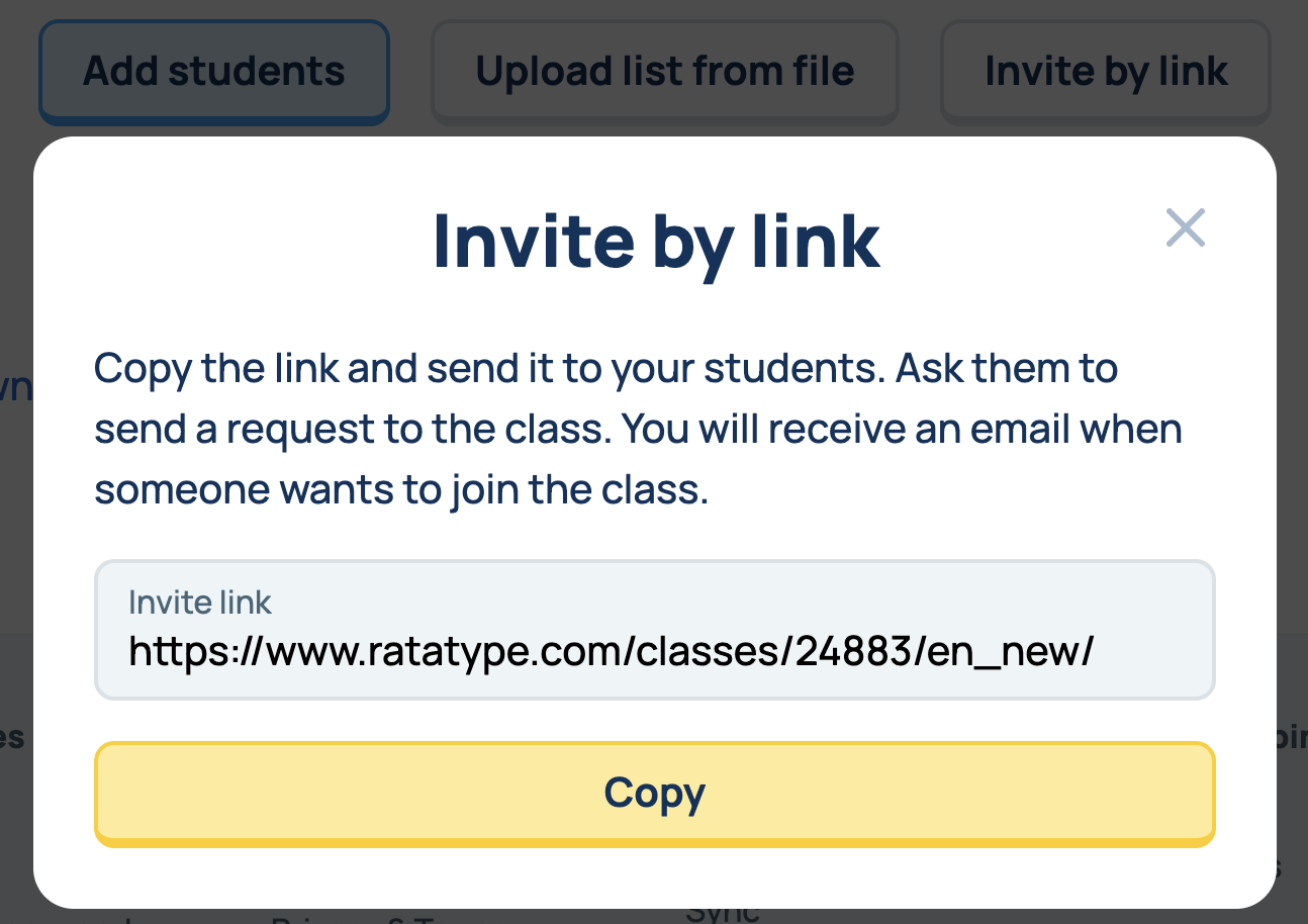 You can ask students to join the class by the link. This option is for students who can register by themselves or already have a Ratatype account.