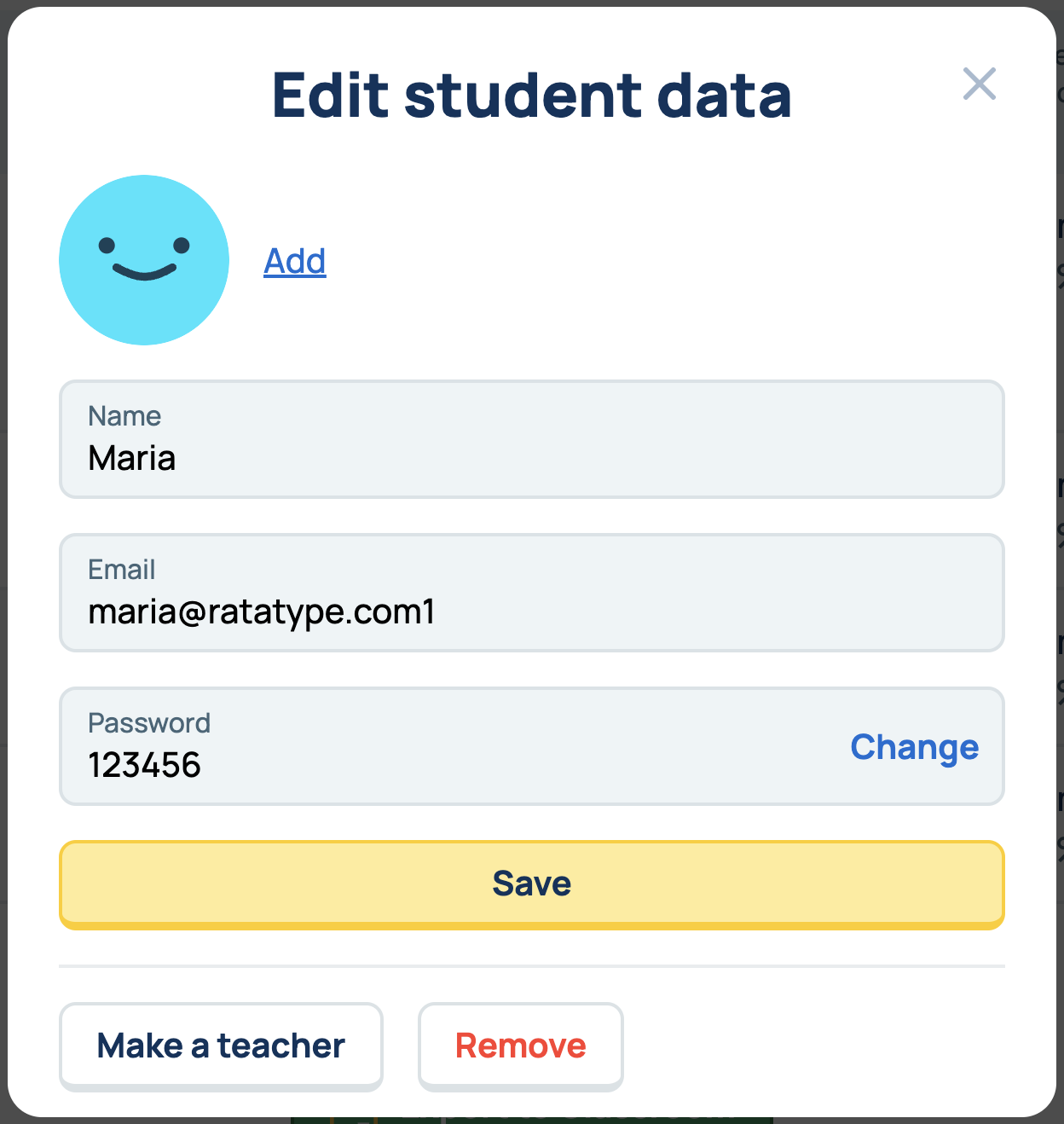 With the touch typing tool for students, you will be able to change names, emails, and even passwords. And also introduce certain restrictions.
