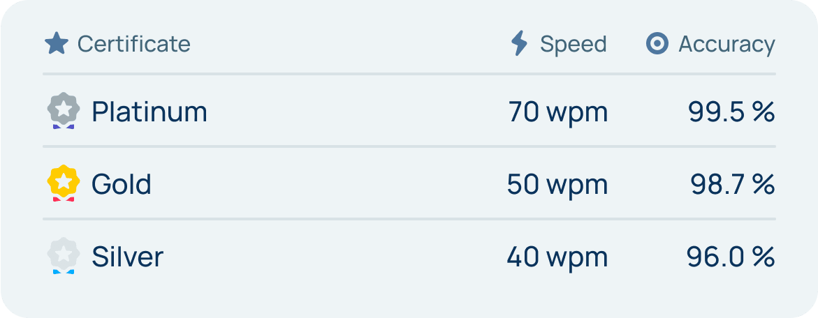 A typing certificate is given for the best result measured in both speed and accuracy. If the accuracy or speed score is lower than the previous, you must practice and improve your result.