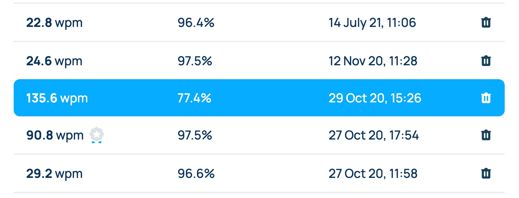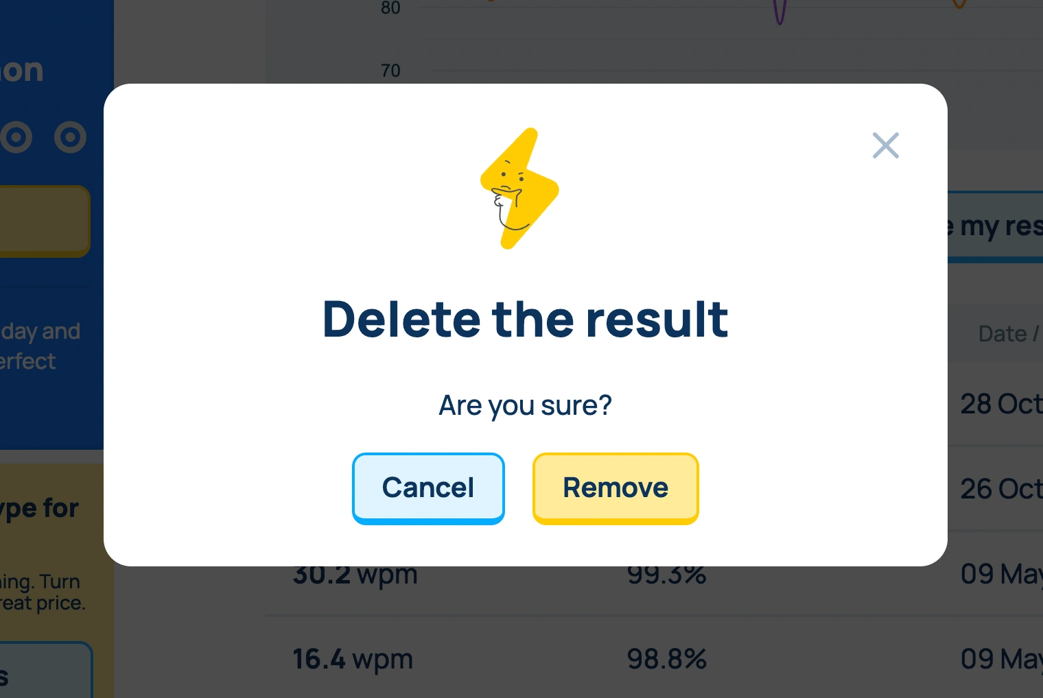 You can delete any speed test result on Ratatype. For example, if someone passed the typing test on your account or you mistakenly received an incorrect result, you can easily remove it from your account.