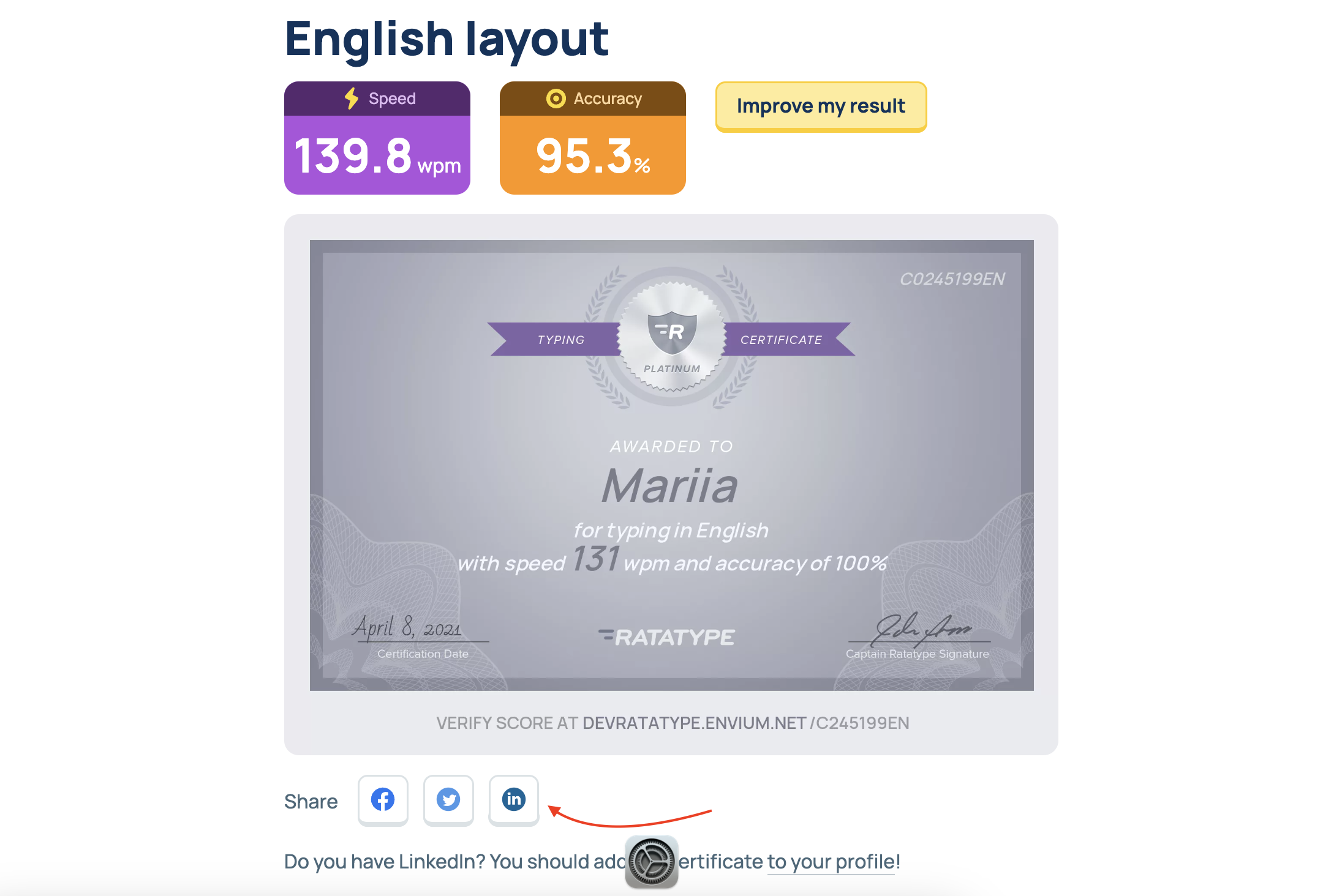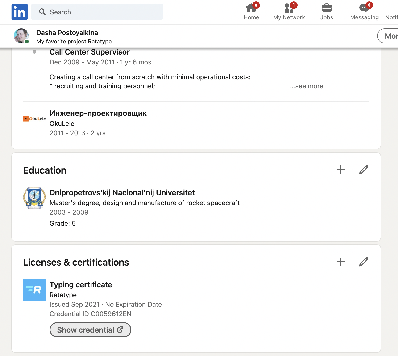 A LinkedIn profile is a good idea to find a job faster. You will be able to add a link to your profile to any CV, and this will significantly increase the attractiveness of your CV among other candidates. A typing certificate from Ratatype will add authority to your profile, attract more attention, and immediately show your typing level to the future employer.