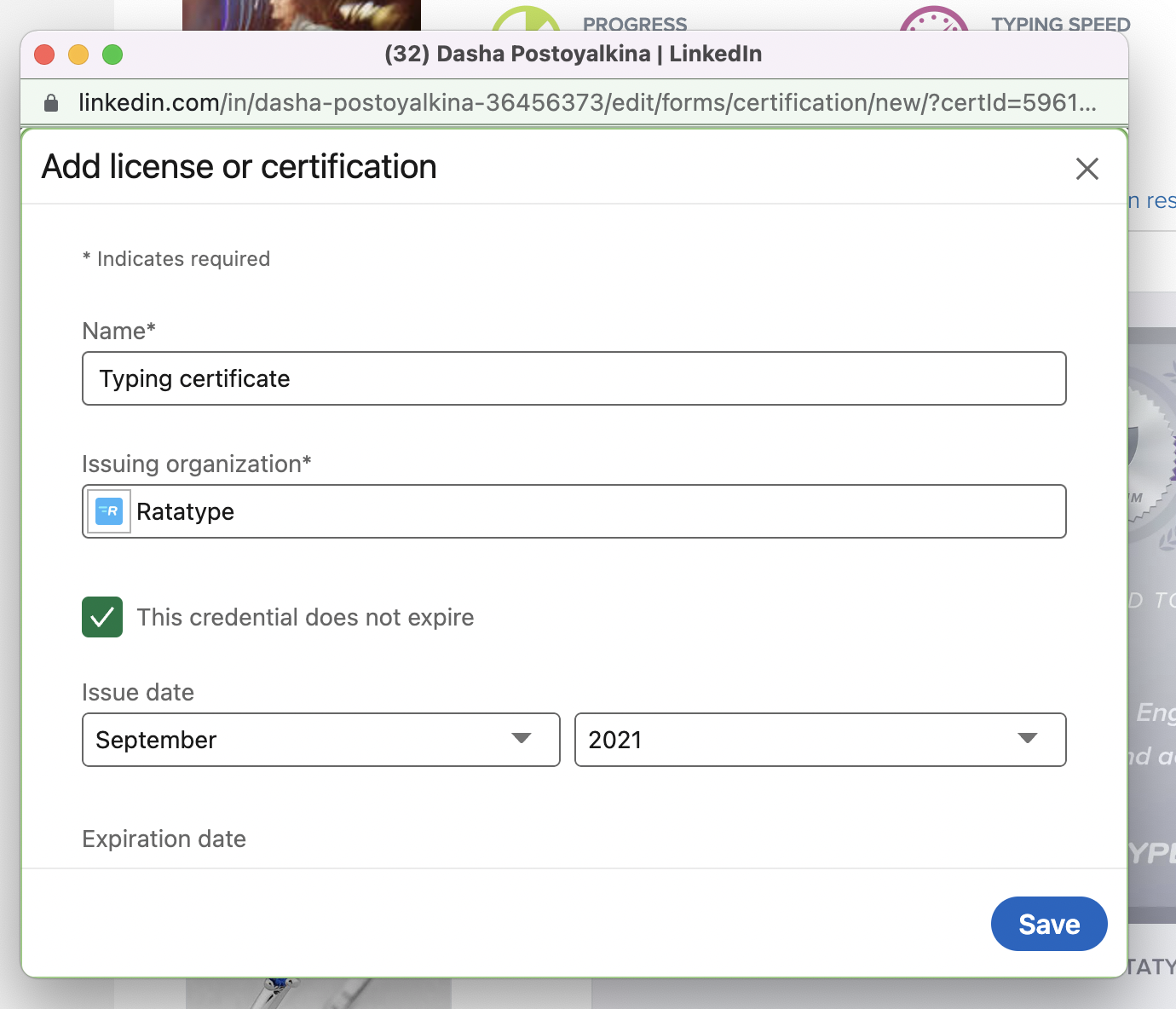 - Done! You now have a certificate from Ratatype on your LinkedIn profile.