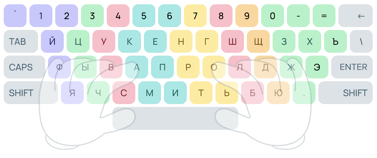 - Нажимай на клавиши только тем пальцем, который для них предназначен. Наша цветовая схема поможет тебе в этом.