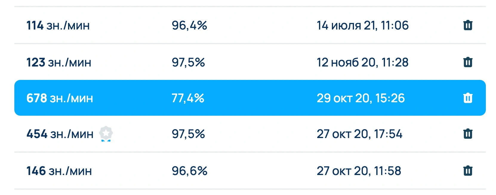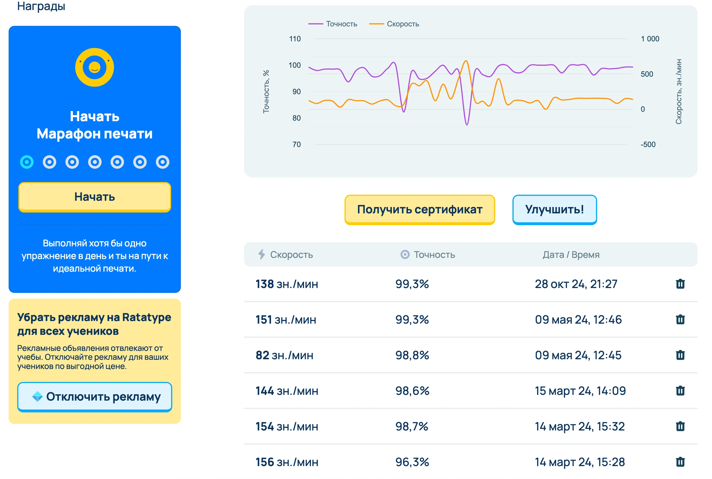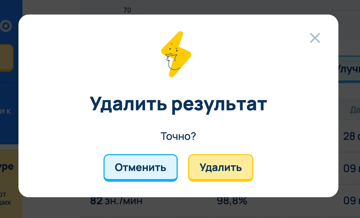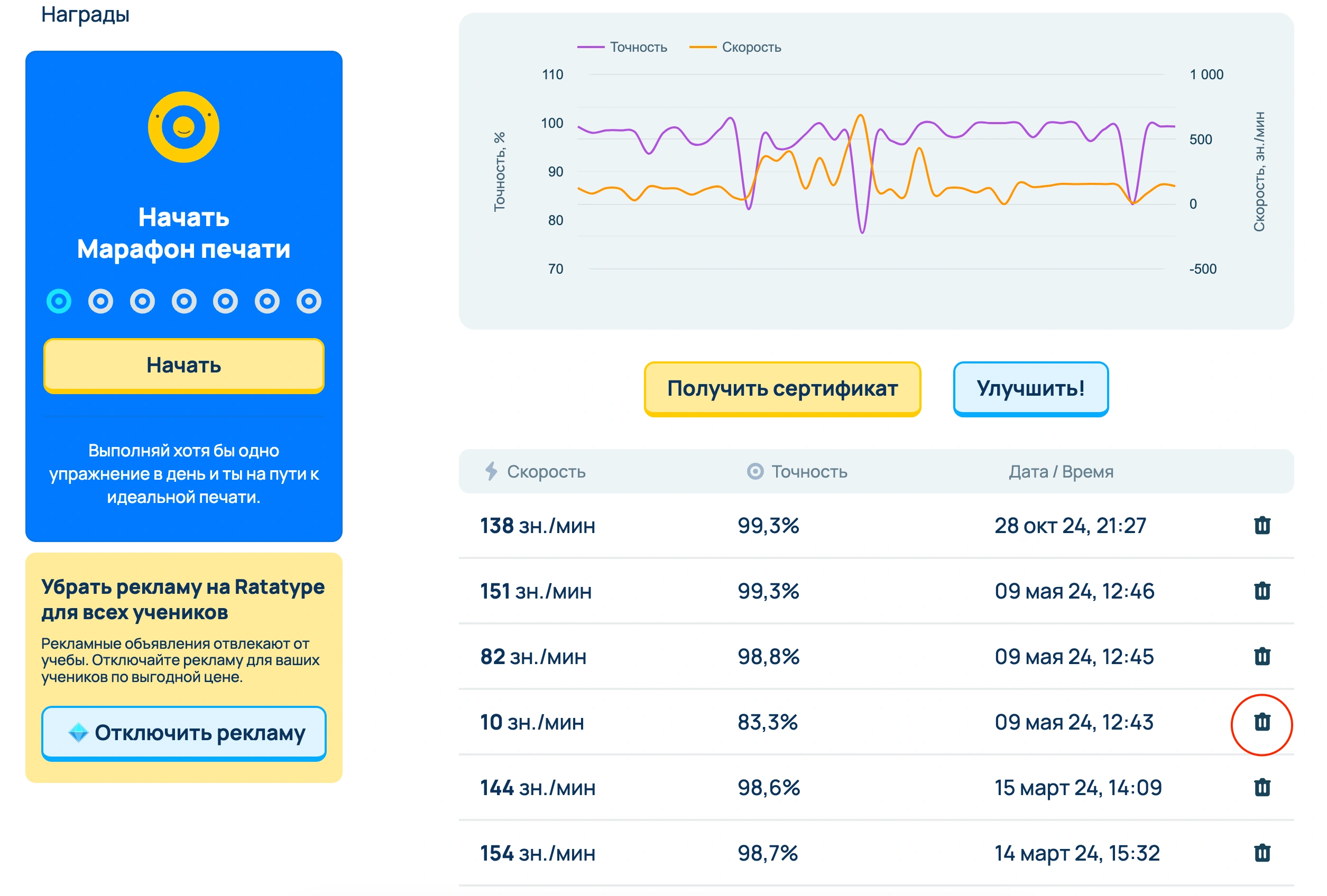На Ratatype можно удалить какой угодно результат тестирования скорости печати. Например, если кто-то прошел тестирование на твоем аккаунте или тебе ошибочно посчитался неправильный результат, то ты с легкостью сможешь его удалить из своей учетной записи.