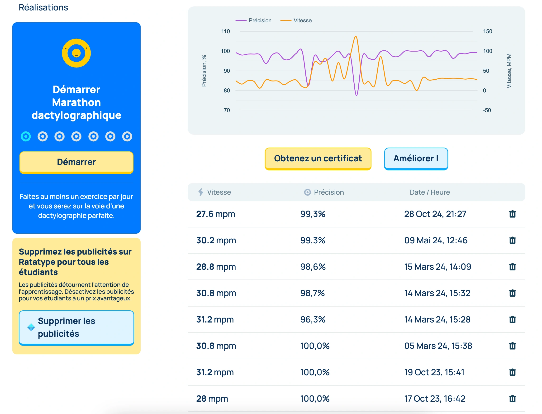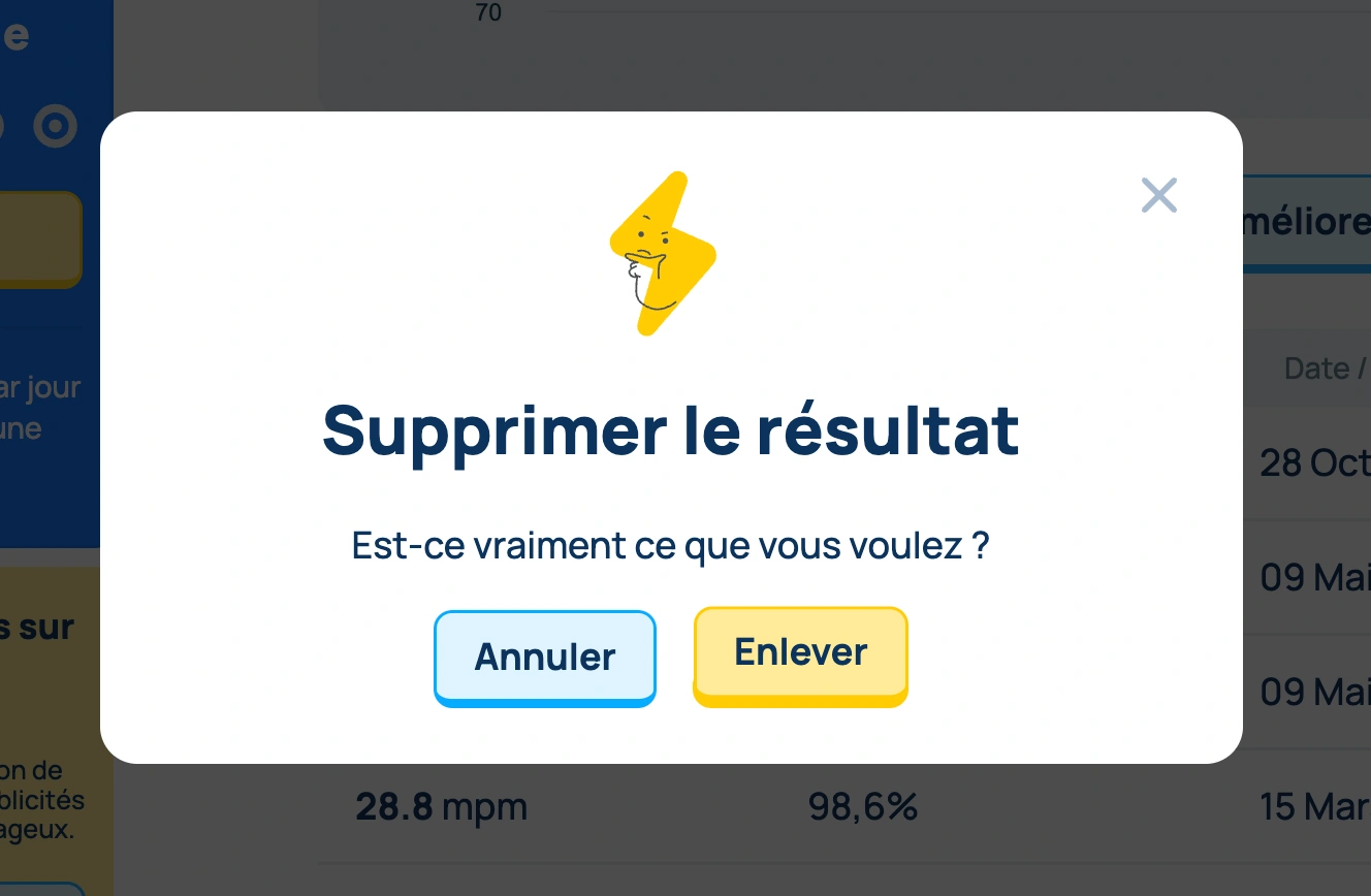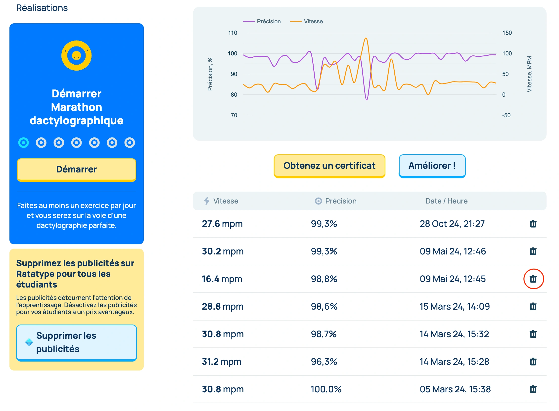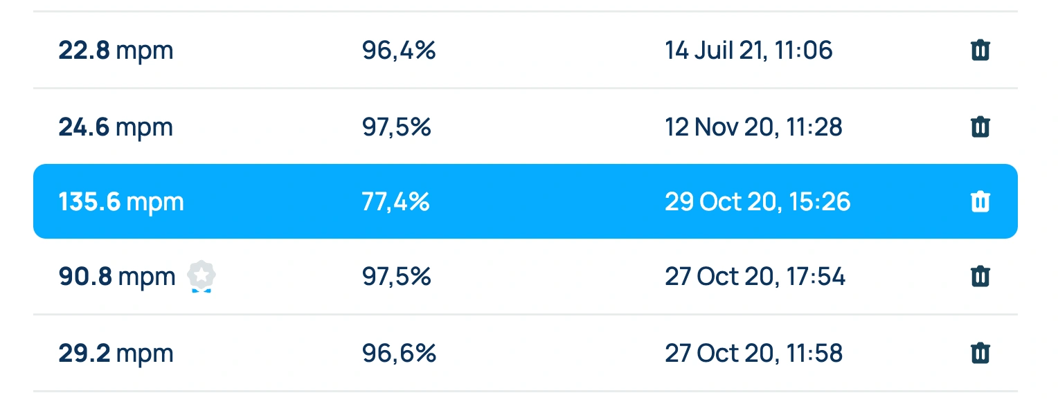 Vous pouvez supprimer n'importe quel résultat de test de vitesse sur Ratatype. Par exemple, si quelqu’un a passé le test de dactylographie sur votre compte ou si un résultat incorrect vous a été attribué par erreur, vous pouvez facilement le supprimer de votre compte.
