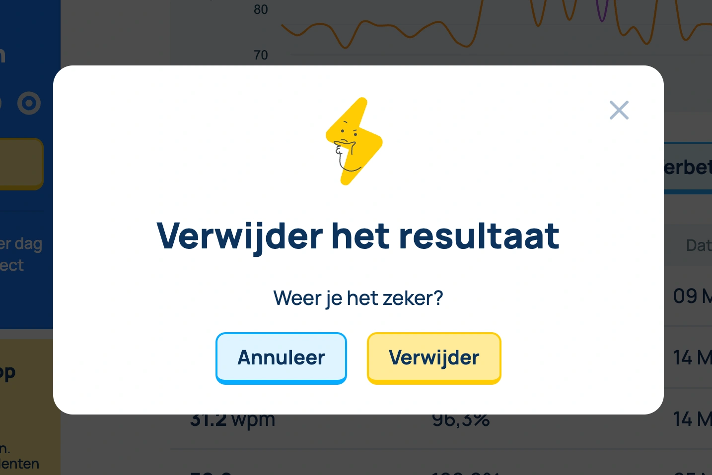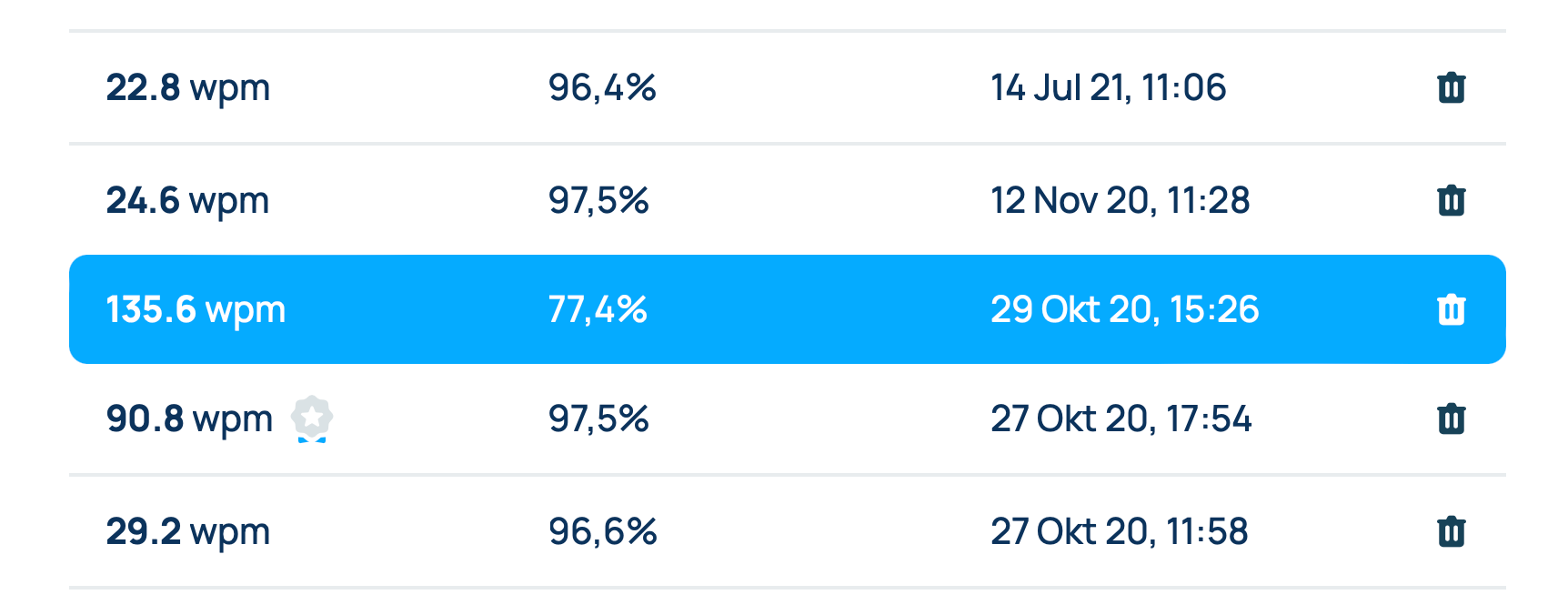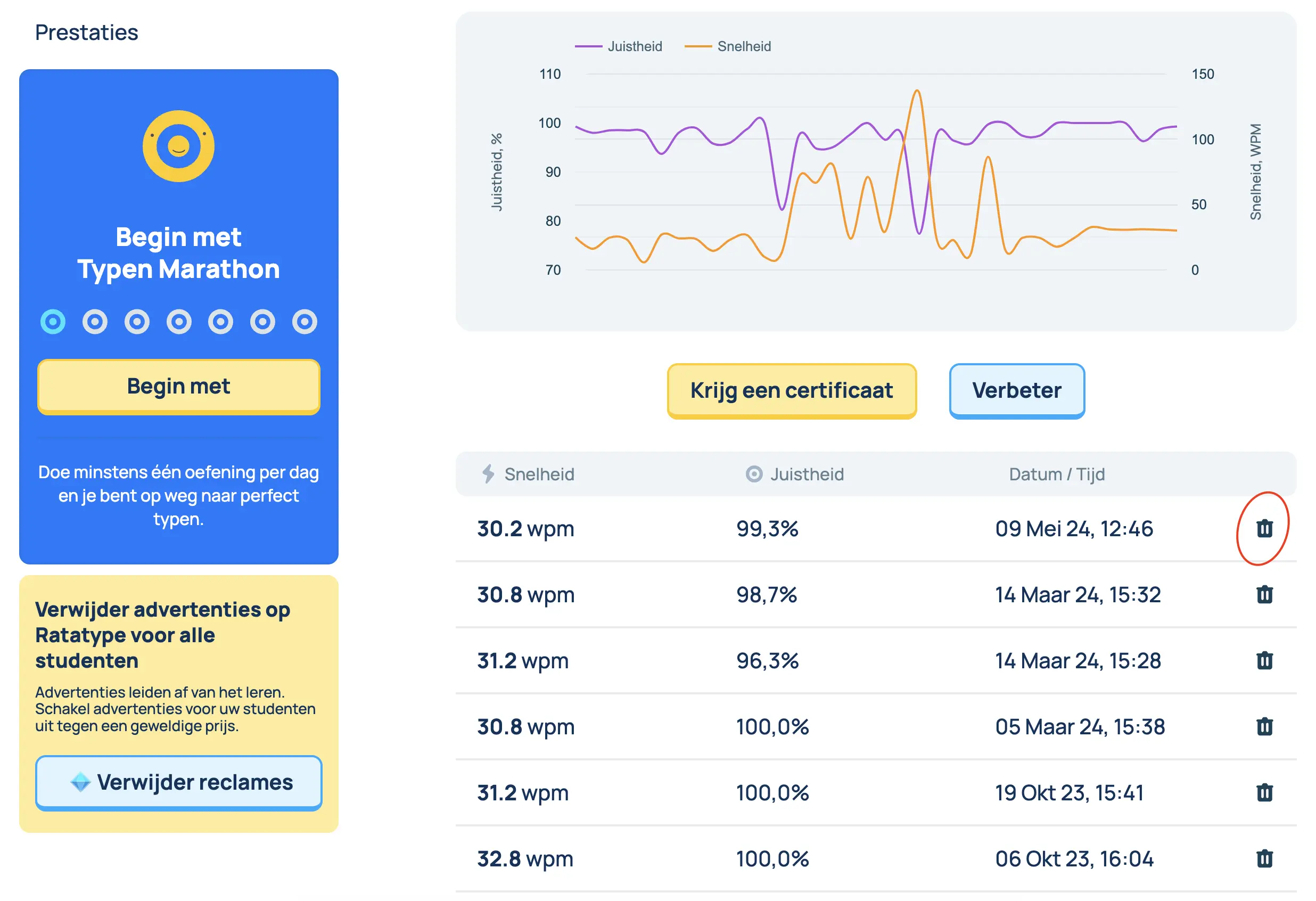 U kunt elk snelheidstestresultaat op Ratatype verwijderen. Als iemand bijvoorbeeld de typetest op uw account heeft gehaald of u per ongeluk een onjuist resultaat hebt ontvangen, kunt u het eenvoudig van uw account verwijderen.